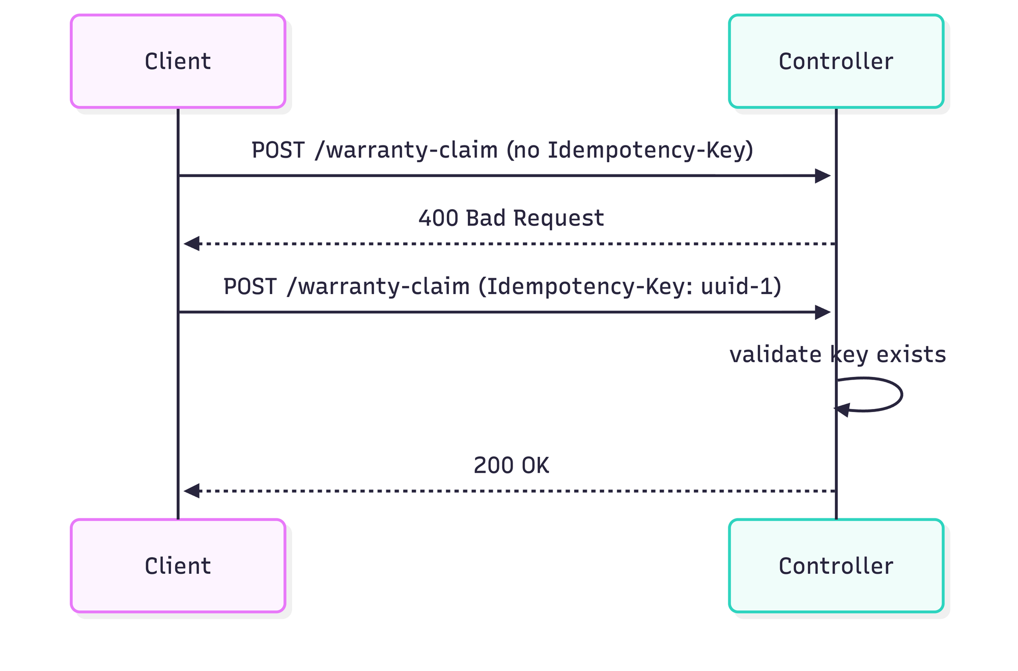 }Making the key mandatory is a deliberate choice. If you make it optional, clients will forget to send it, and you lose all the safety guarantees downstream. A 400 at the door is better than a duplicate charge in production.