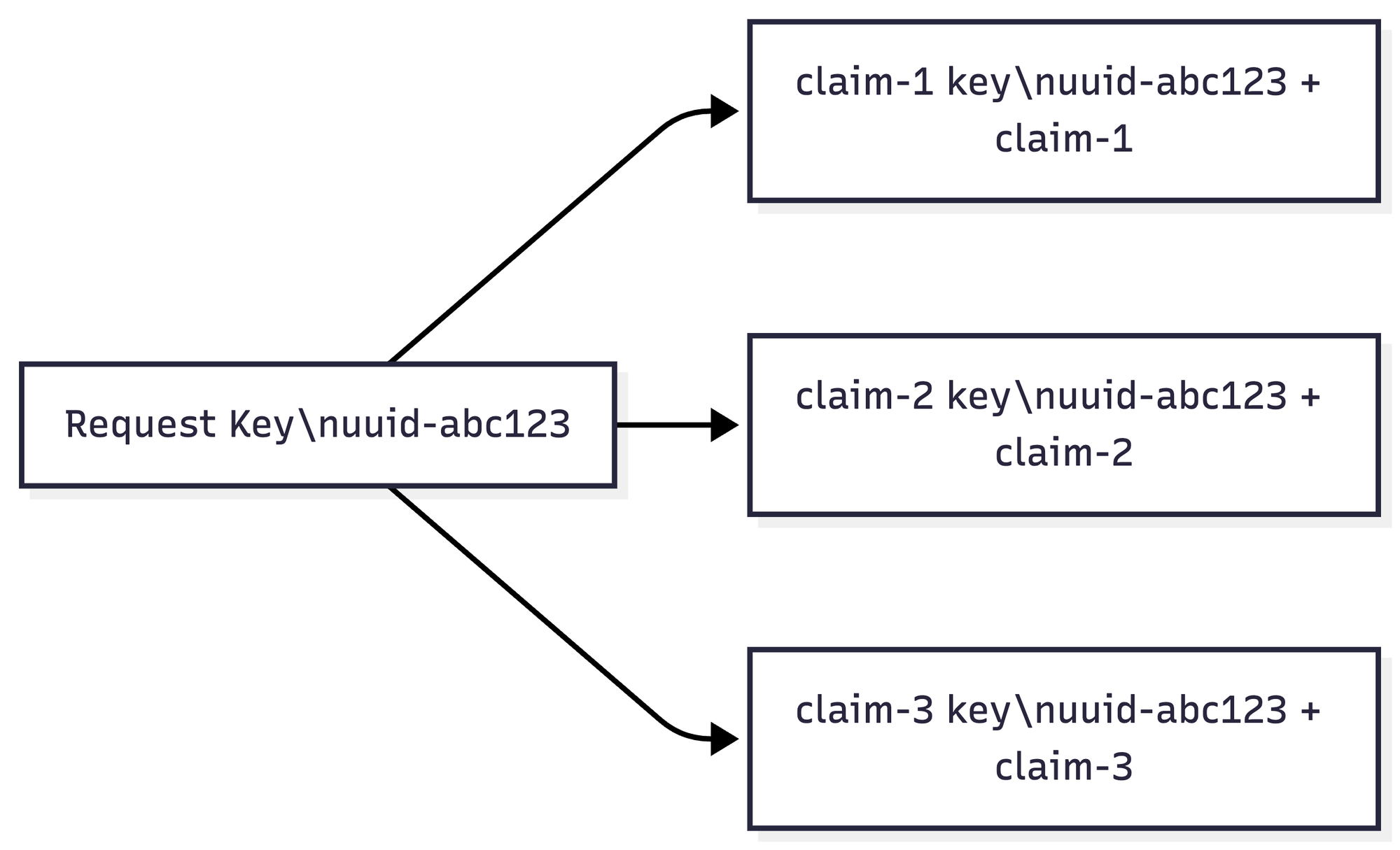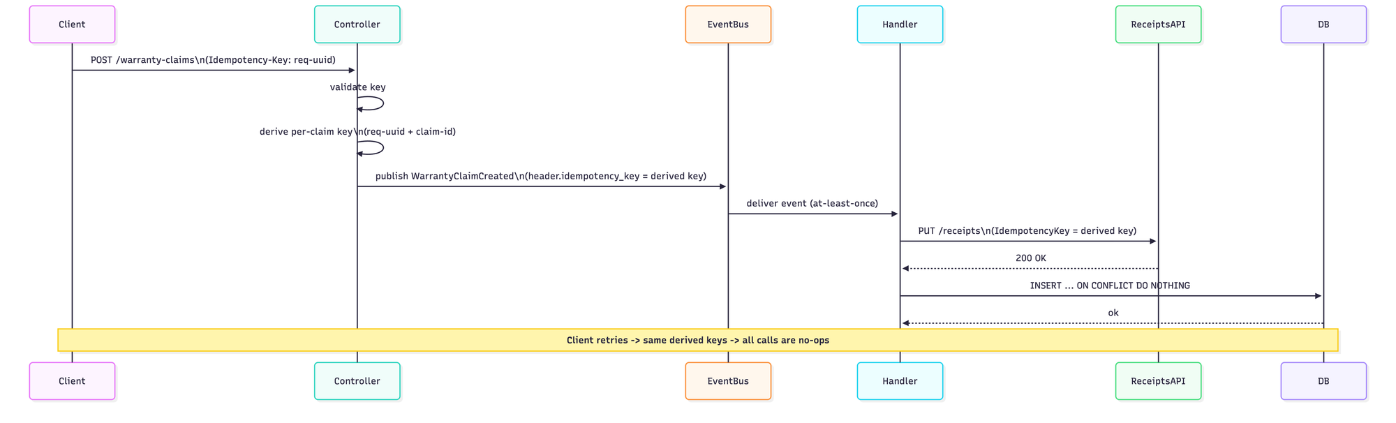 }The key property here is determinism: given the same request key and the same claim ID, you always get the same derived key. So if the client retries the request, the handler will derive the exact same per-claim keys, and every downstream operation will recognize them as duplicates.