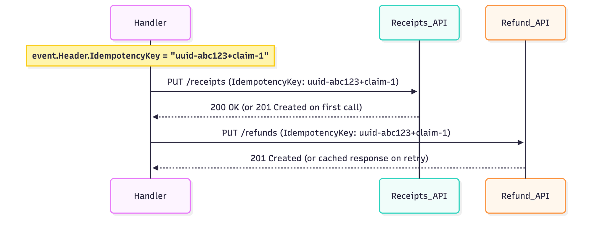 When a handler needs to call an external API (receipts service, transportation API), it should extract the idempotency key from the event header and pass it along. This makes the external call idempotent too, not just the local processing.