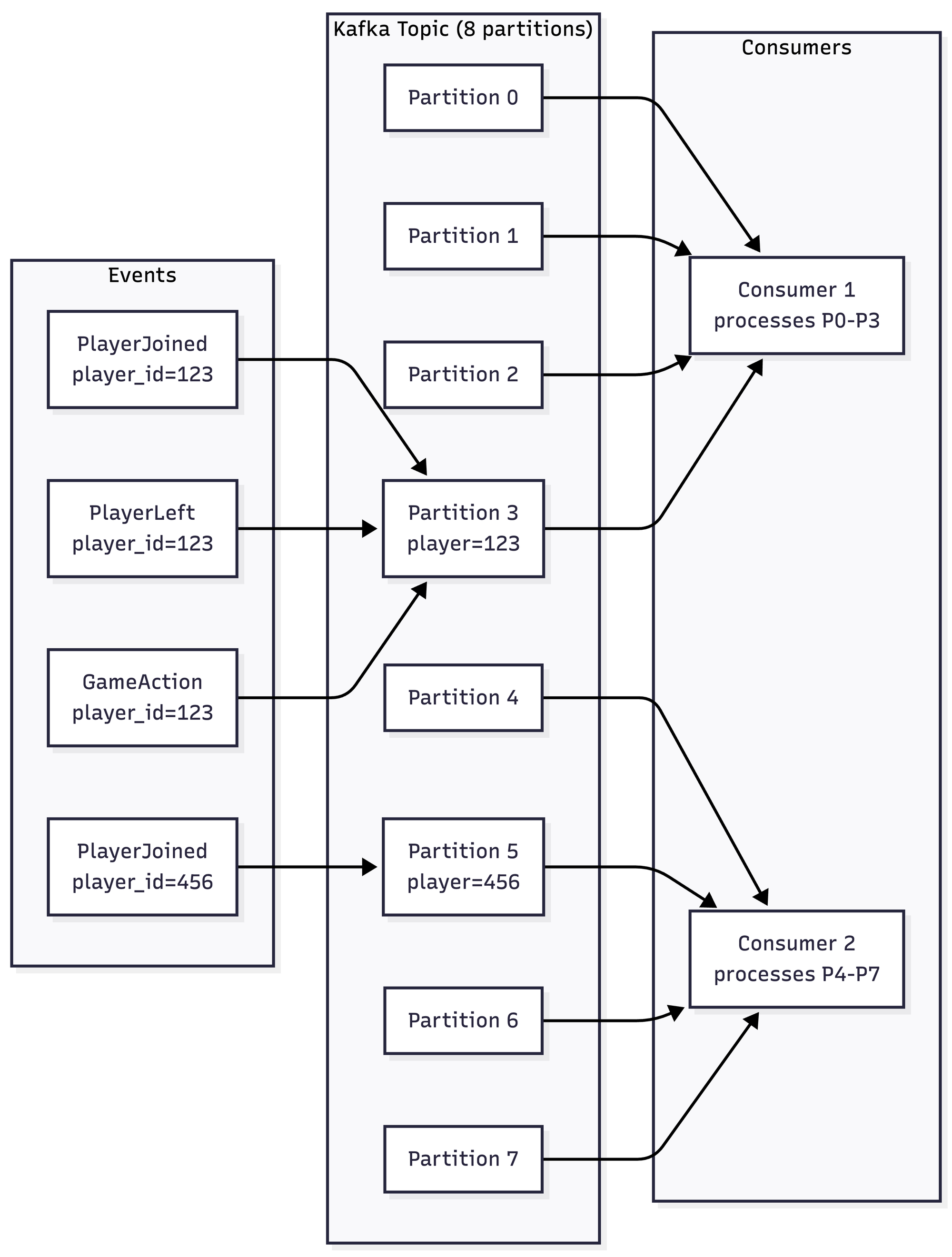 All events for player 123 go to partition 3. All events for player 456 go to partition 5. Consumer 1 handles partition 3 sequentially. Consumer 2 handles partition 5 sequentially. Perfect per-entity ordering with cross-entity parallelism.
